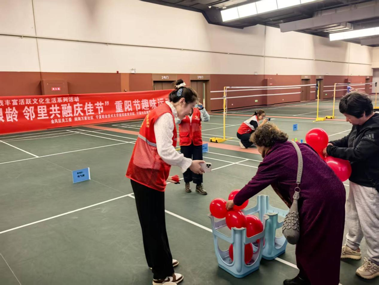 在我国第十三个“老年节”即将到来之际,结合“敬老月”,阅海万家社区示范点联合宁夏职业技术大学继续教育学院、宁夏社区教育指导中心、宁夏跃贯网羽中心,精心策划了“情暖重阳映银龄 邻里共融庆佳节”重阳节趣味运动会。这场兼具趣味性、互动性的文体盛宴,让辖区老年人在欢声笑语中舒展筋骨、增进情谊,切实感受到“老有所乐”的温暖与幸福。