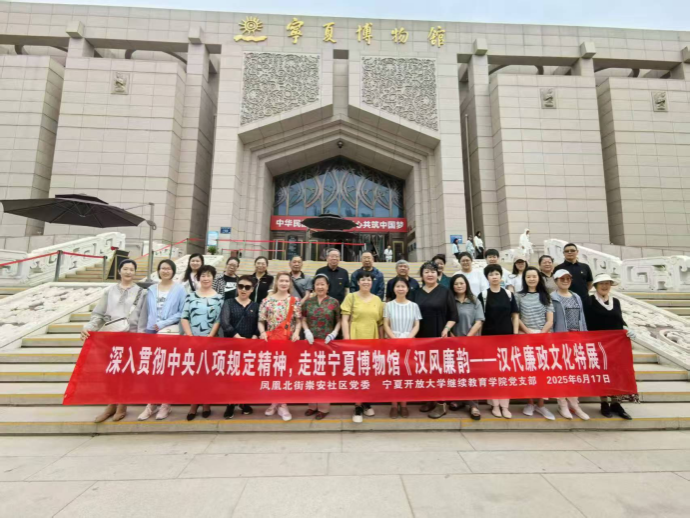 2025年6月17日,宁夏职业技术学院继续教育学院党支部与凤凰北街崇安社区党委共同赴宁夏博物馆,开展“深入贯彻中央八项规定精神,走进《汉风廉韵——汉代廉政文化特展》”主题党日活动。此次活动旨在通过历史文化载体,深化党员对中央八项规定精神的理解和把握。在博物馆讲解员的引导下,全体人员集中参观了《汉风廉韵——汉代廉政文化特展》。