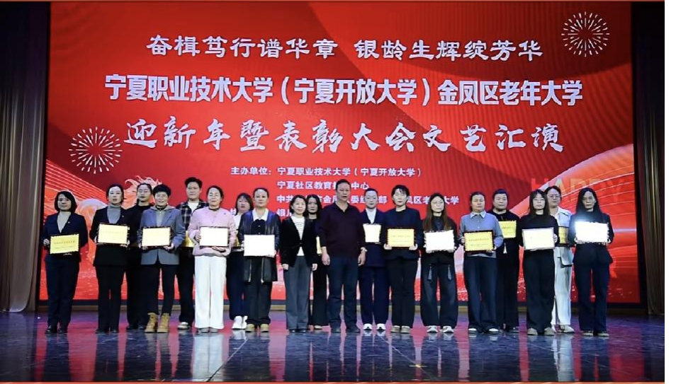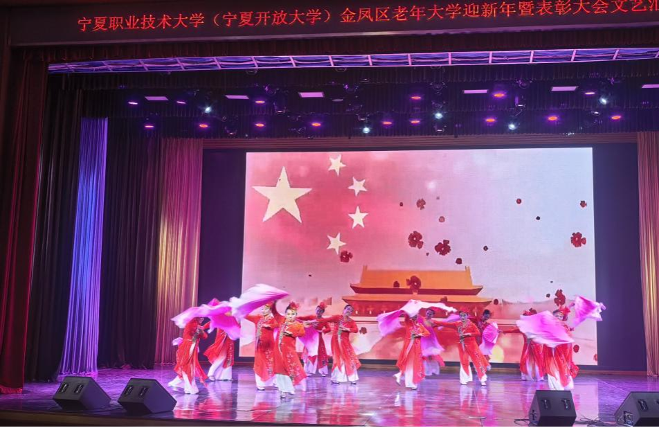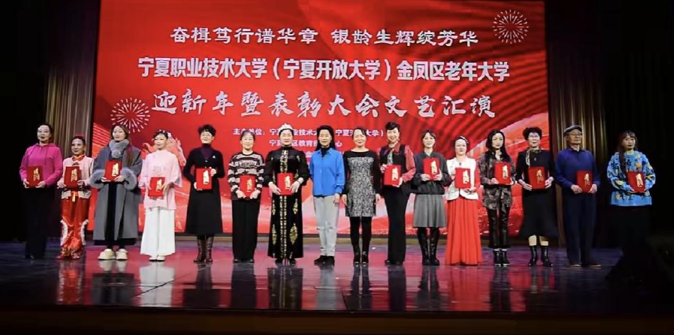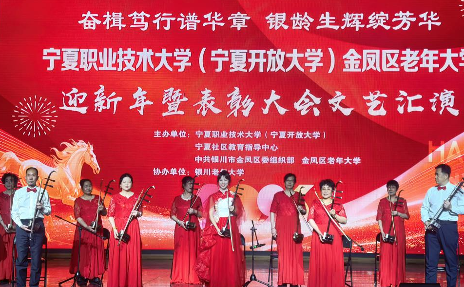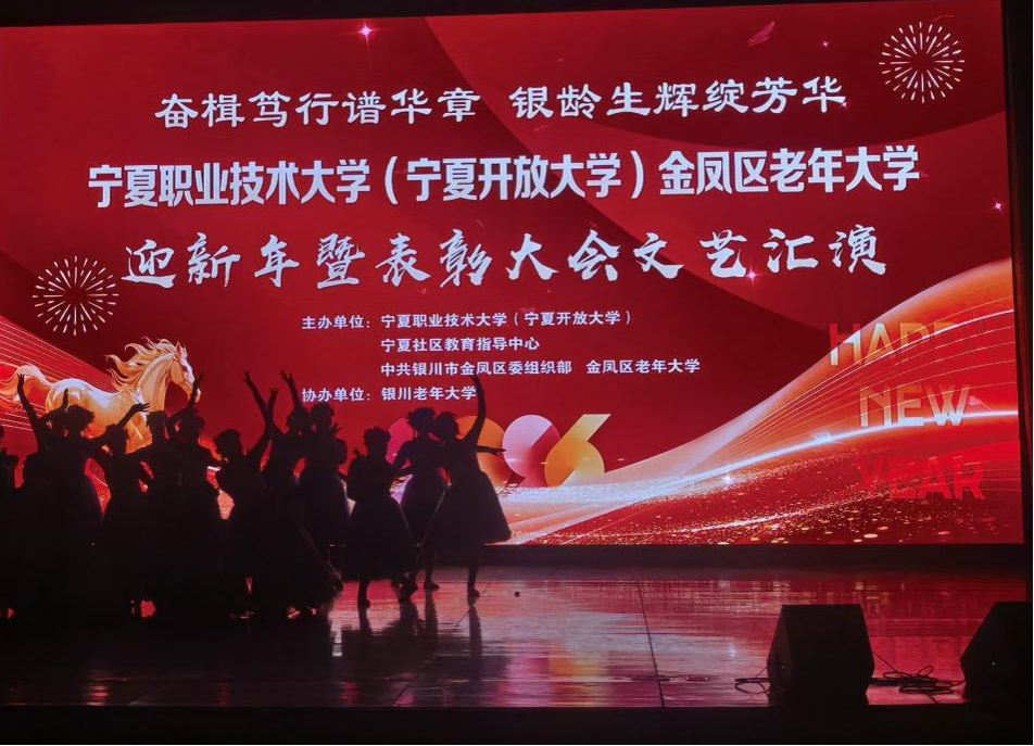 12月31日下午,由宁夏职业技术大学(宁夏开放大学)、宁夏社区教育指导中心、中共银川市金凤区委组织部、金凤区老年大学主办,银川老年大学协办的金凤区老年大学迎新暨表彰大会文艺汇演在银川文化艺术馆举行,来自宁夏老年大学、银川老年大学、金凤区老年大学相关负责人、辖区各社区书记、社区教育工作者及300余名老年大学师生欢聚一堂,以文艺献礼辞旧岁,以表彰先进启新程,共同迎接新年。